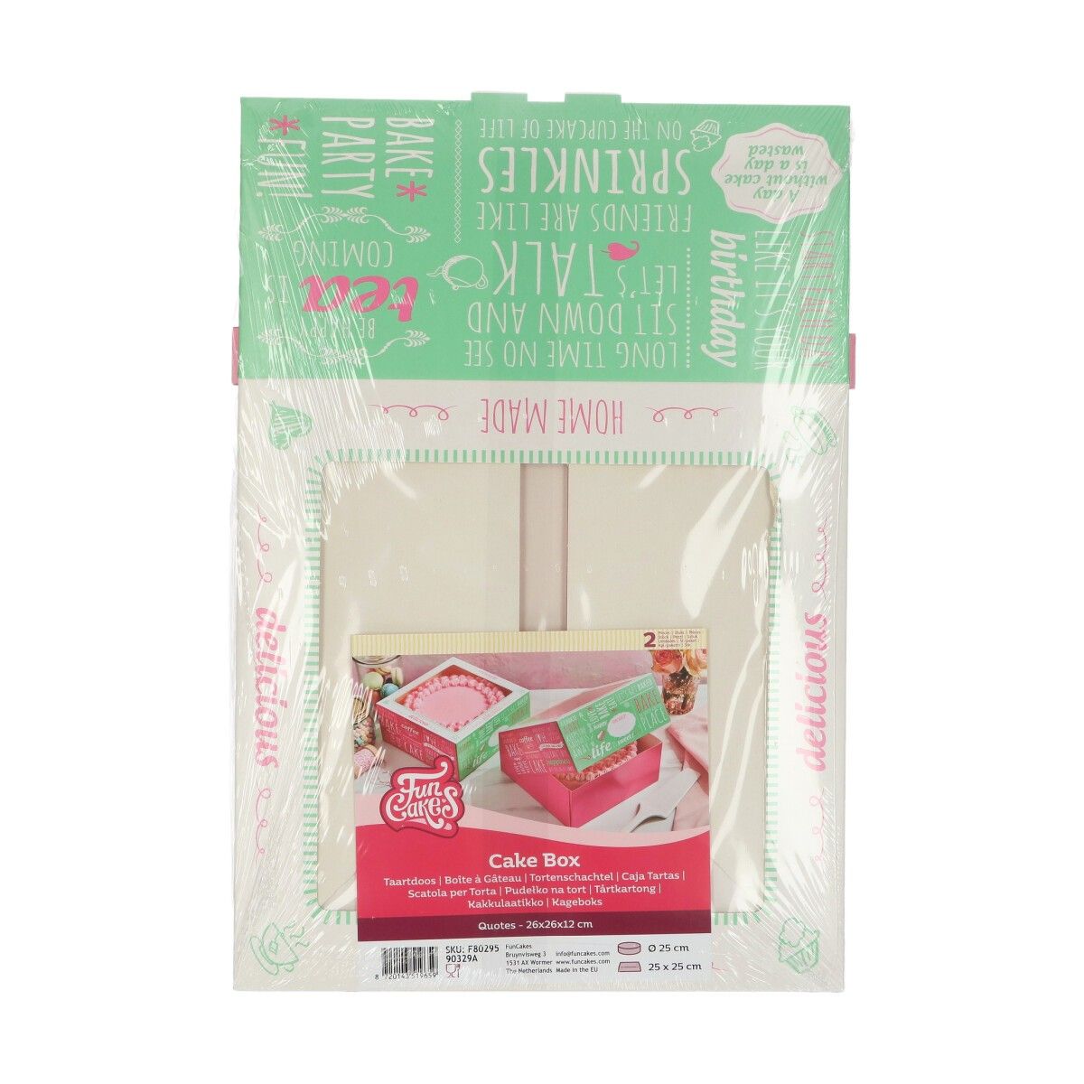 Dortová krabice čtverec potisk citáty v růžovo-zelené barvě, sada 2 ks. Krabice je vhodná pro dorty 25 x 25 cm nebo o průměru 25 cm.