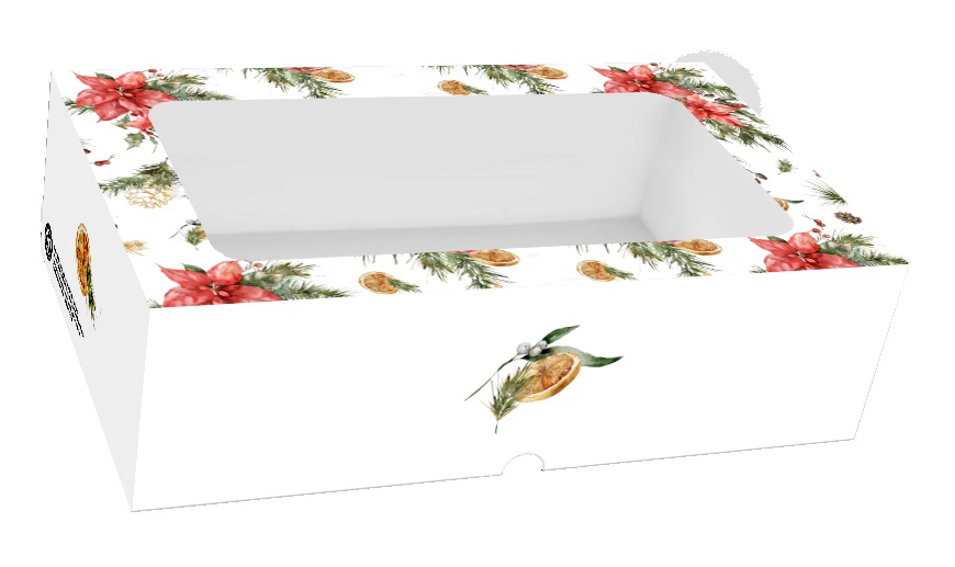 Krásná vánoční krabice na cukroví s motivem vánoční hvězdy, jmelí a sušeného pomeranče má okénko, je vhodná pro vánoční cukroví, perníčky, čajové pečivo nebo dárky.