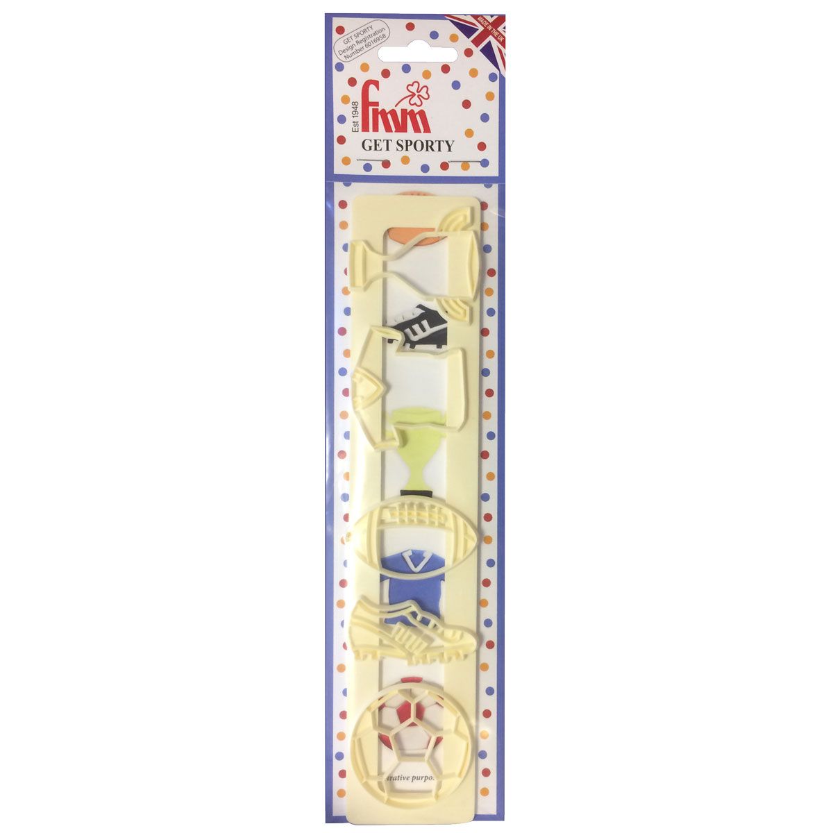 Vytvořte originální sportovní dorty během chvilky s plastovou vykrajovací lištou „Get Sporty“ od FMM Sugarcraft! Tato praktická lišta obsahuje 5 sportovních motivů, které snadno vykrojíte z fondánové hmoty nebo marcipánu – ideální pro všechny fanoušky fotbalu a sportu obecně.